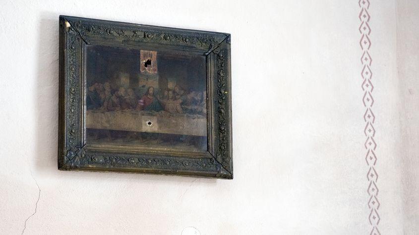 Maica Pamfilia descuie biserica și ne arată portretul celui care a adus școala în sat. Mai încolo, în altar, se păstrează o icoană împușcată când s-au retras trupele sovietice, în ’58. Înainte să moară, sătenii care o țineau în casă au donat-o mănăstirii.