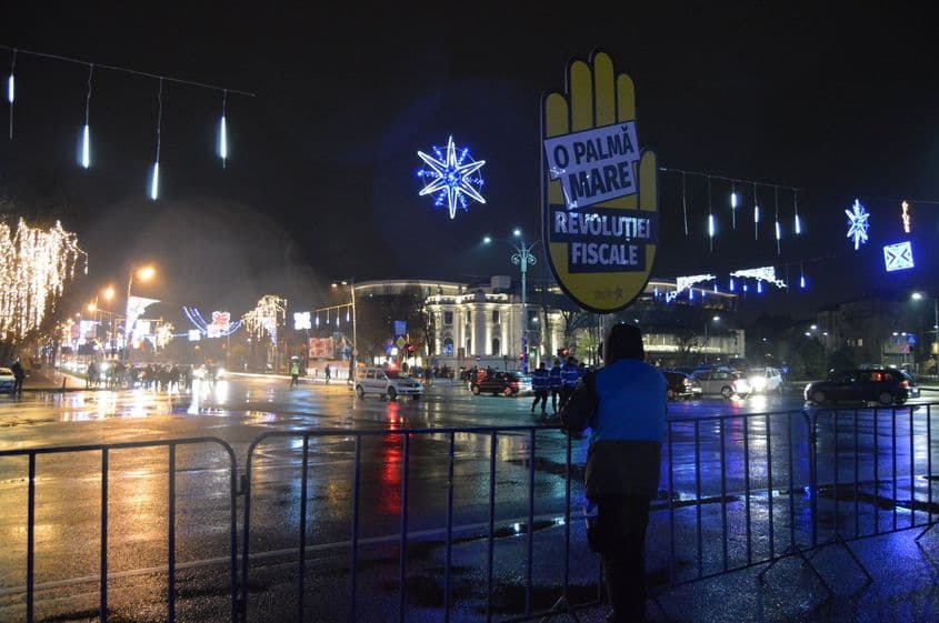 El purta o pancartă mare, în formă de mână, pe care era inscripționat mesajul: „O palmă mare revoluției fiscale”.