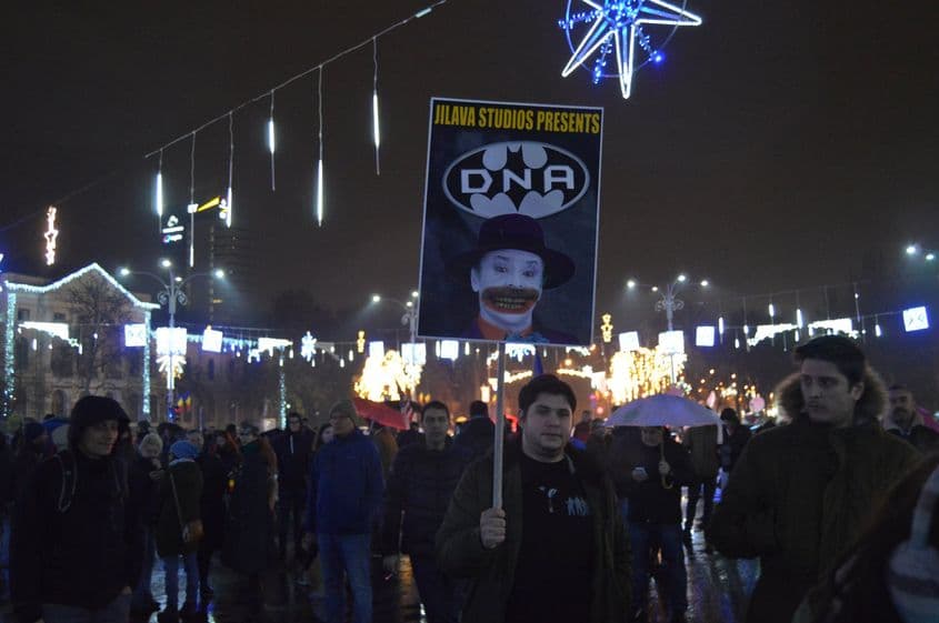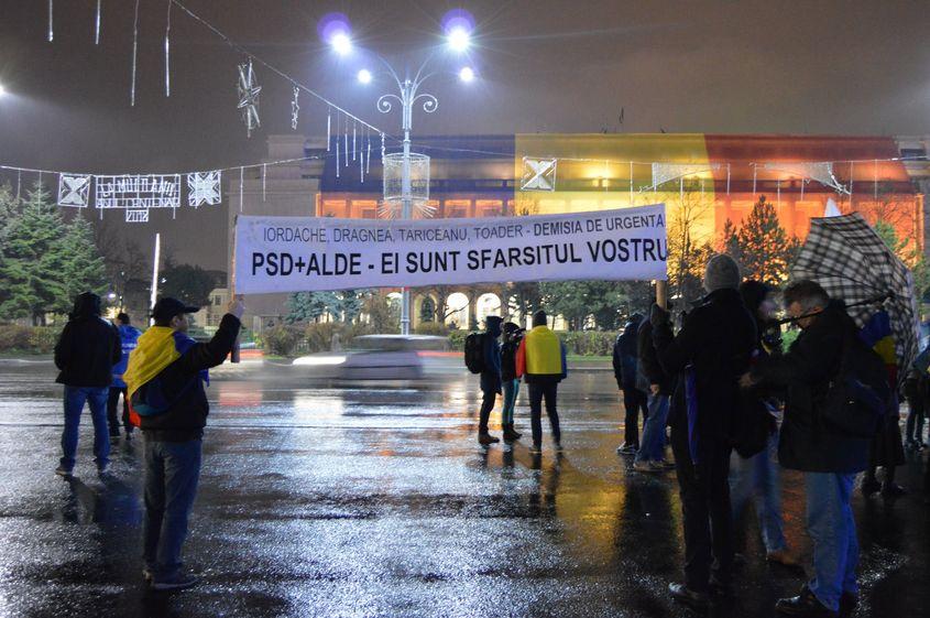Din mulțimea care intona „Treceți, batalioane române, Carpații” ieşea în evidență o pancartă albă pe care scria „Iordache, Dragnea, Tăriceanu, Toader – Demisia de urgență! PSD+ALDE – Ei sunt sfârșitul vostru”.