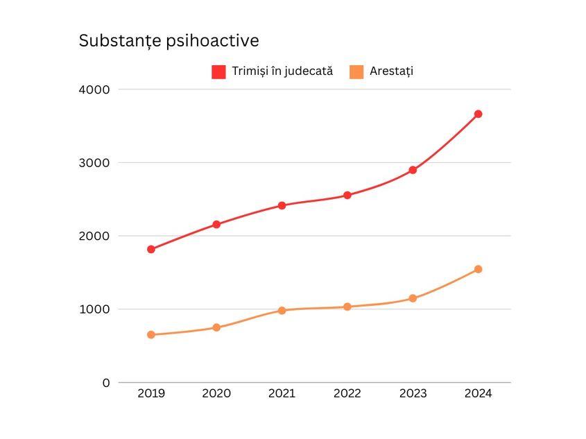 În mod normal, numărul celor arestați sau trimiși în judecată pentru infracțiuni legate de droguri ar trebui să scadă odată cu scăderea cantităților confiscate. În România, se întâmplă tocmai invers - fiecare an începând din 2019 până în 2024 a atins un nou record absolut de persoane arestate și trimise în judecată, chiar dacă cantitățile de droguri s-au redus la jumătate în această perioadă. De asemenea, și nivelul dosarelor penale pentru droguri (deținere-consum și trafic) a ajuns la un maxim istoric de 32.292, dublu față anul 2019.