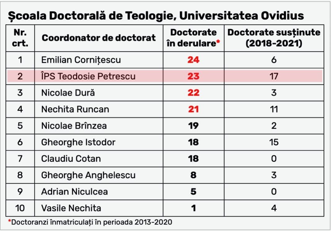 - 4 coordonatori, printre care și ÎPS Teodosie, au în îndrumare peste 20 de doctoranzi, fapt ce încalcă prevederile interne ale Universității „Ovidius”, care a stabilit o limită maximă de 20 de doctoranzi coordonați simultan.