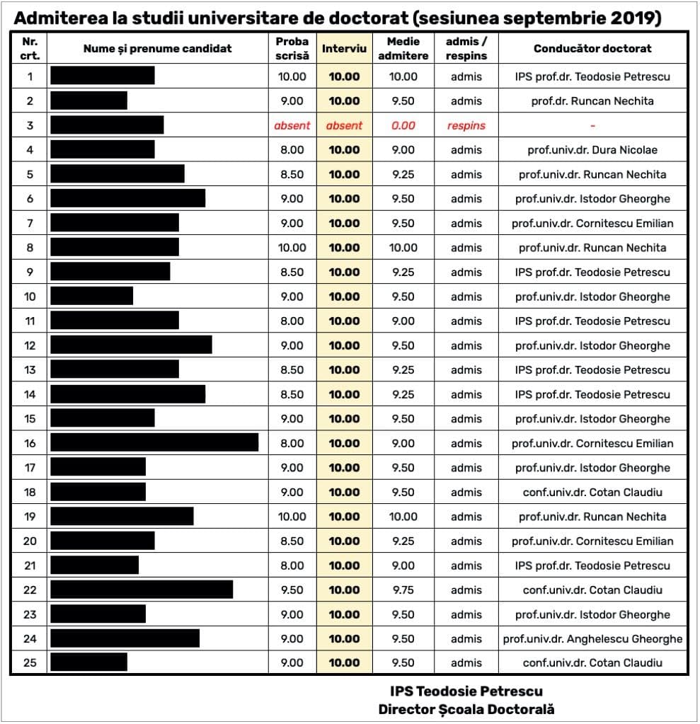 - cel puțin 15 de teze de doctorat au fost invalidate de CNATDCU imediat după susținerea publică începând cu 2016;