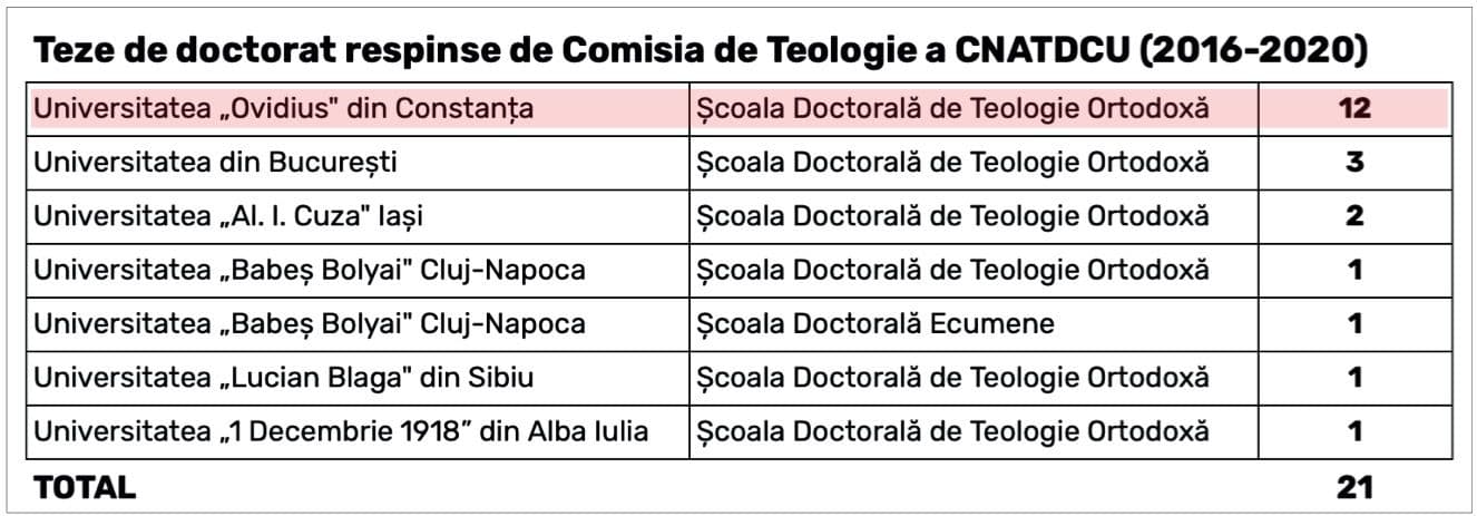 Datele publice referitoare la activitatea Comisiei de Teologie a CNATDCU arată că cea mai mare problemă din perspectiva nerespectării standardelor de etică academică este la Școala doctorală de Teologie Ortodoxă de la Universitatea Ovidius din Constanța – care funcționează sub autoritatea eclezială a lui Teodosie, Arhiepiscopul Tomisului.