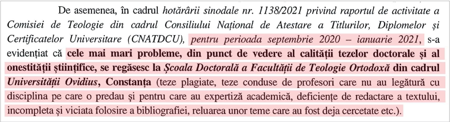 „În cadrul hotărârii sinodale nr. 1138/2021 privind raportul de activitate a Comisiei de Teologie din cadrul Consiliului Național de Atestare a Titlurilor, Diplomelor și Certificatelor Universitare (CNATDCU) pentru perioada septembrie 2020 – ianuarie 2021, s-a evidențiat că cele mai mari probleme, din punct de vedere al calității tezelor doctorale și al onestității științifice, se regăsesc la Școala Doctorală a Facultății de Teologie Ortodoxă din cadrul Universității Ovidius, Constanța (teze plagiate, teze conduse de profesori care nu au legătură cu disciplina pe care o predau și pentru care au expertiză academică, deficiențe de redactare a textului, incompleta și viciata folosire a bibliografiei, reluarea unor teme care au fost deja cercetate etc.)”.