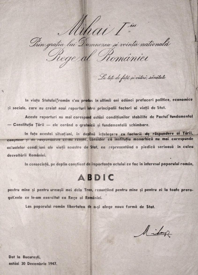 În consecință, pe deplin conștient de importanța actului ce-l fac în interesul poporului român, abdic pentru mine și pentru urmașii mei la tron, renunțând pentru mine și pentru ei la toate prerogativele ce le-am exercitat ca rege al României.”