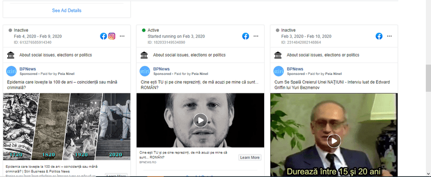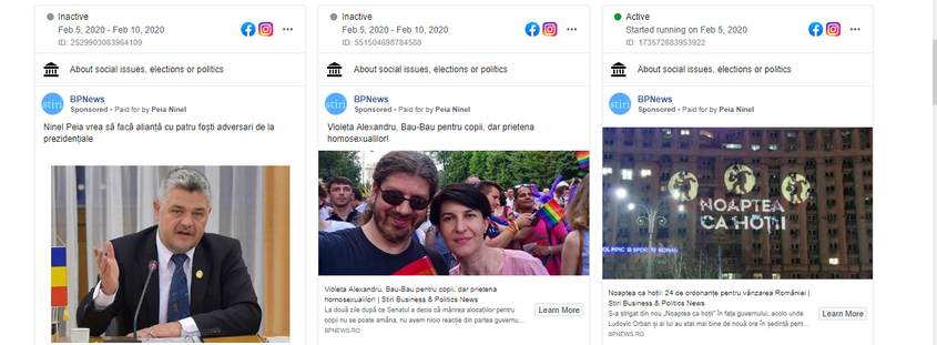 Potrivit RoTLD, domeniul în cauză, bpnews.ro, este cumpărat de o persoană fizică – în consecință, numele acesteia nu este public. Dar putem vedea cine plătește pentru toate materialele sponsorizate de pagina Facebook asociată site-ului: tot Ninel Peia.