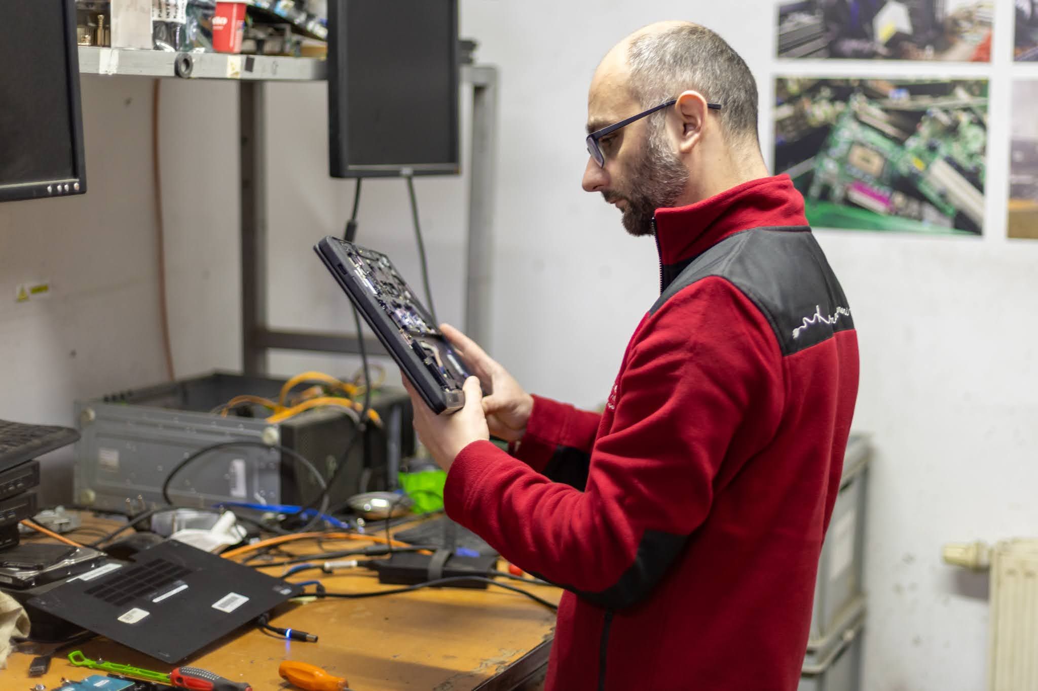 Aici lucrează oameni aflați într-un program de inserție socio-profesională – persoane vulnerabile care se formează, învață și descoperă cum e să muncești într-un loc unde ești acceptat și sprijinit. Este, de fapt, un lanț al solidarității: oameni cu vulnerabilități recondiționează calculatoarele donate de companii, care ajung apoi la copii din medii defavorizate.