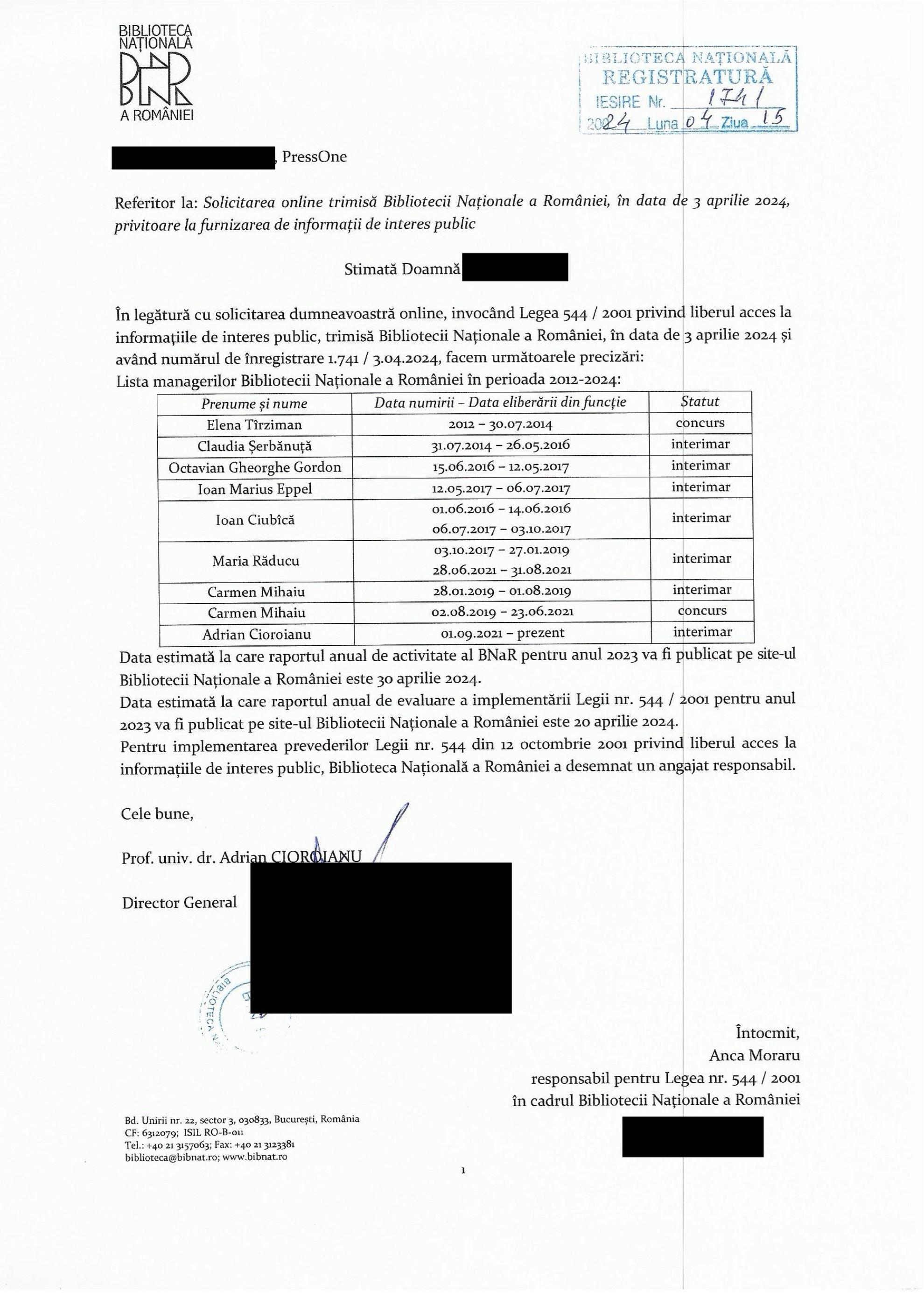 Răspunsul Ministerului Culturii, transmis după 52 de zile și repetate insistențe, este datat 25 aprilie 2024, ora 12:32 - aceeași zi în care instituția a postat pe site, la ora 10:26, anunțul concursului pentru postul ocupat de interimarul Cioroianu. În mesajul de răspuns, ministerul își explică decizia de a nu-l investiga pe Adrian Cioroianu.