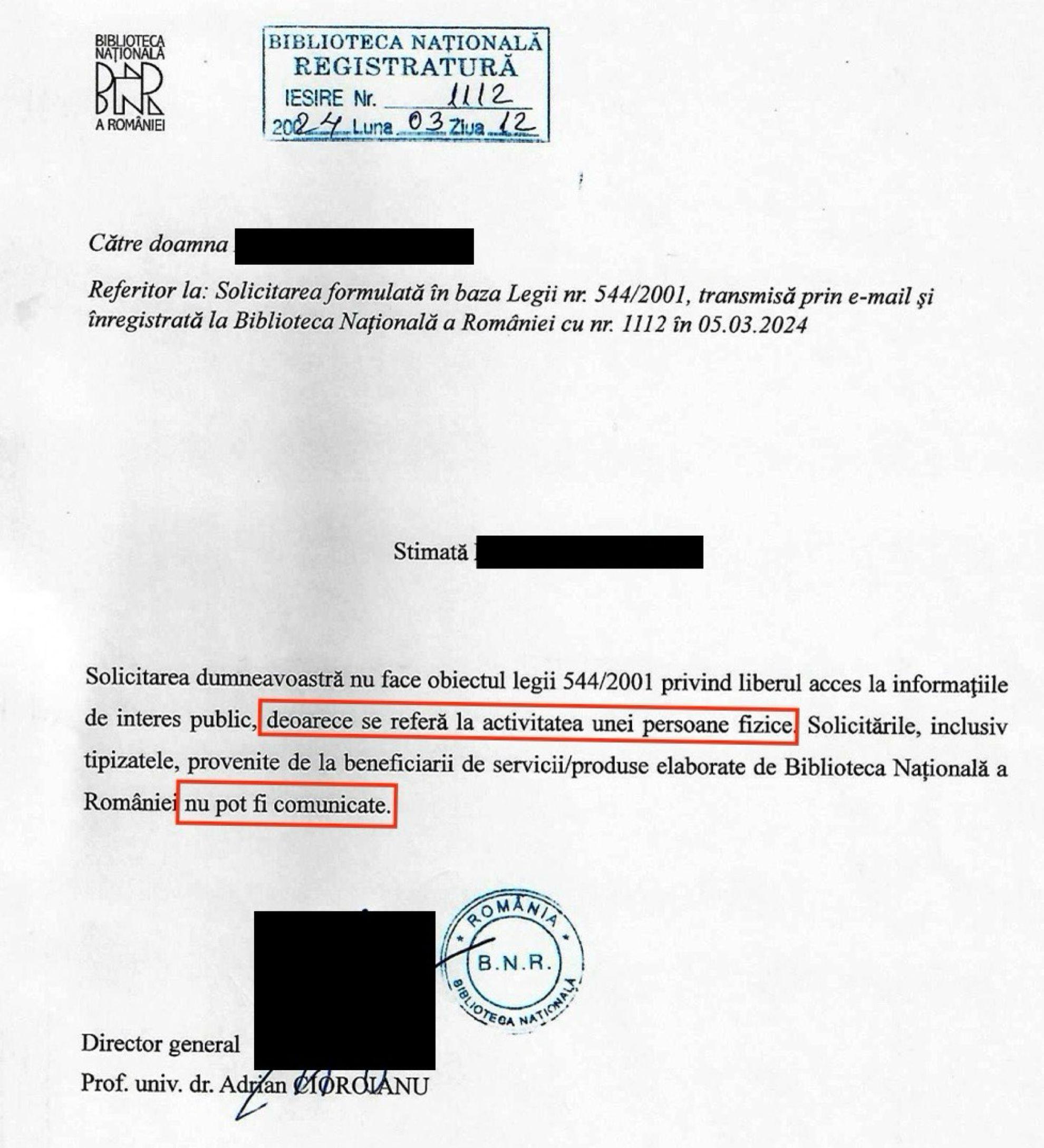 Cererea de digitalizare făcută de un utilizator nu intră, însă, în categoria informațiilor publice, fapt confirmat chiar de refuzul oficial al BNaR de a furniza PressOne - în baza Legii 544/2001 a accesului la informații publice - date despre lucrările solicitate / consultate de Emilia Șercan.