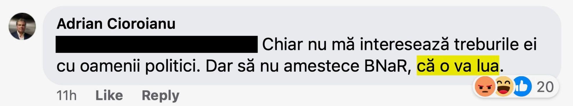 Raluca Turcan a dat prima declarație pe tema conduitei lui Adrian Cioroianu la 1 martie, a doua zi după ce acesta a divulgat subiectul investigației Emiliei Șercan, pe care a și amenințat-o în mai multe comentarii pe Facebook („să nu amestece BNaR, că o va lua” sau„o face, o primește”).