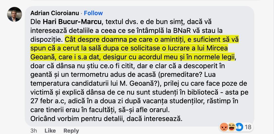 Informația se referea la faptul că Emilia Șercan, care-și publică investigațiile pe PressOne încă din 2015, a consultat la sala de lectură a instituției pe care Cioroianu o conduce teza de doctorat a lui Mircea Geoană, secretarul general adjunct al NATO.
