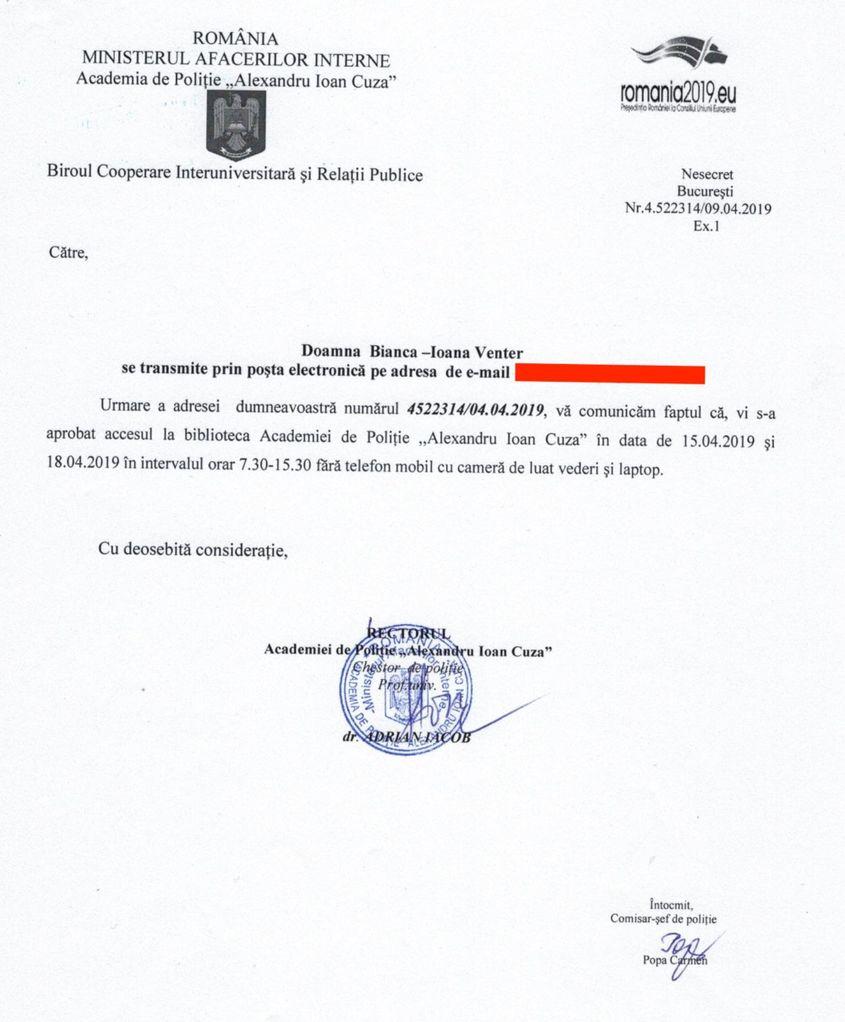 În lunile martie şi aprilie am trimis patru solicitări de acces la biblioteca Academiei de Poliţie, pentru a studia mai multe teze de doctorat.