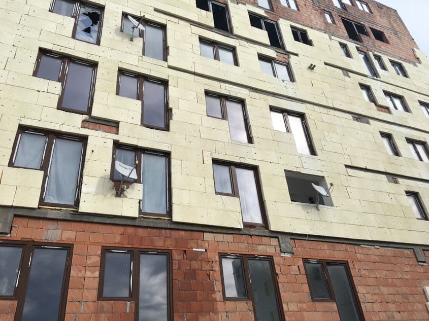 Blocul din cartierul Zorilor este megalitic, cu parterele șubrede expuse, ca niște carii. Munți de materiale de construcție putrezesc peste maldăre de pământ, urme de locuire se zăresc printre zăbrele de fier beton ruginite. Un câine, care pare de-al casei, doarme pe o saltea aruncată la colțul clădirii și nici nu se sinchisește să se ridice, doar ne petrece cu privirea.