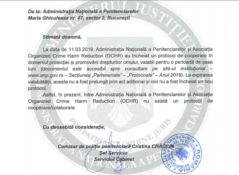 OCHR, clona, mai susține, pe site, că este în parteneriat cu Administrația Națională a Penitenciarelor (ANP). Potrivit unui răspuns primit de PressOne de la ANP, OCHR a avut un parteneriat cu aceasta, dar a durat doar 6 luni, în 2019 și nu a fost reînnoit.