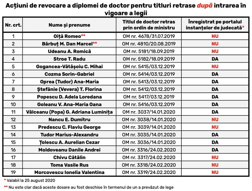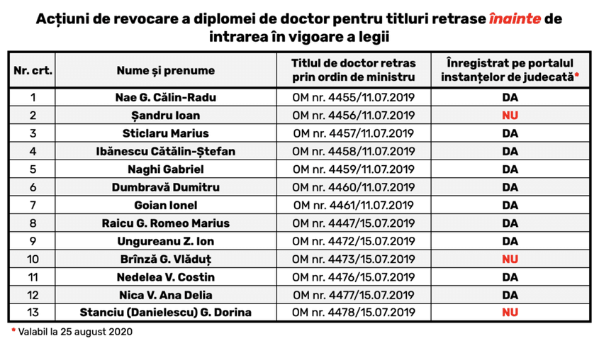 Printre cele 20 de dosare care apar înregistrate la Curtea de Apel București pe 13 iulie 2020, 10 sunt ale unor persoane cărora li s-a retras titlul la data de 11 iulie și la data de 15 iulie 2019.