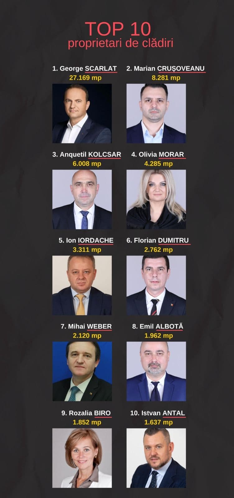 Senatorul PNL George Scarlat este candidatul care deține cei mai mulți metri pătrați de construcții: peste 27 de mii Cea mai mare suprafață o are un spațiu comercial și de producție din localitatea Tulucești, județul Galați, cumpărat de senator în 2020, de 26 de mii de metri pătrați.
