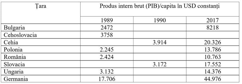 Raportul dintre PIB pe cap de locuitor al Germaniei în 2017 față de cel mai avansat și, respectiv, cel mai puțin avansat stat ex-comunist din grupul selectat este de 2/1 (față de Cehia) și 5/1 (cu Bulgaria). În 1989, el varia de la 4,5/1 (față de Cehoslovacia) până la 8/1 (Polonia).