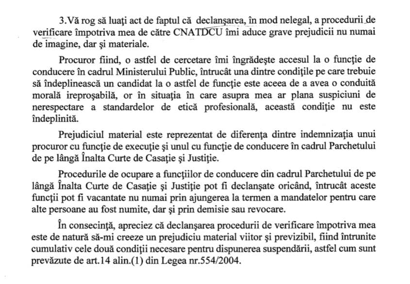 - declanșarea procedurii de verificare împotriva sa de către CNATDCU îi aduce grave prejudicii nu numai de imagine, dar și materiale, iar o astfel de cercetare „îi îngrădește accesul la o funcție de conducere în cadrul Ministerului Public”.