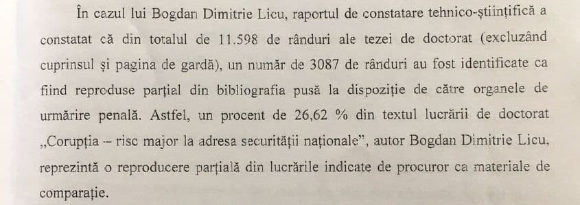 Specialiștii ORDA au mai constatat că 26,6% din textul lucrării de doctorat a lui Licu „reprezintă o reproducere parțială din lucrările indicate de procuror ca material de comparație”.