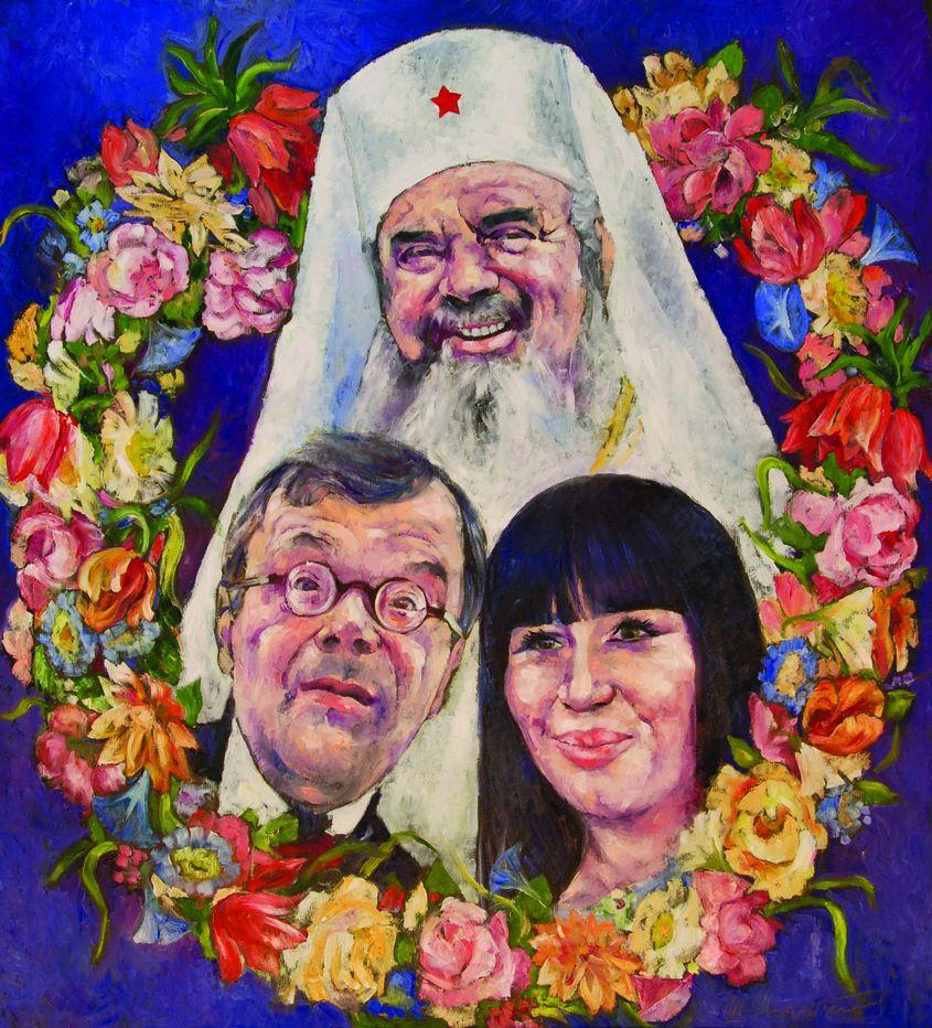 Altă pictură constă într-un trio inedit – Daniel Barbu, fost ministru al Culturii, Patriarhul Daniel și Elena Băsescu, mezina fostului președinte (foto jos). Tabloul se intitulează „Eba, Sida și Daniel”, iar ideea care l-a generat este un joc de cuvinte și de imagini.