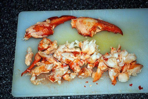 Carnea de homar se taie şi ea în bucăţele cât mai mici. Eu am oprit carnea din cleşti, pentru ornare şi halit separat.
