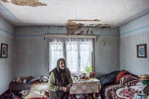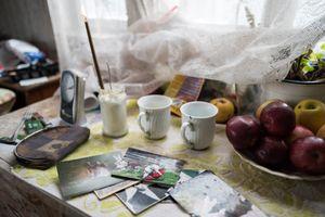 Încăperea în care trăieşte lelea Viorica e un depozit cu tavanul coșcovit. Îmbrăcată gros, femeia împletește ciorapi așteptându-l pe părintele de la mănăstire să vină cu Crucea.