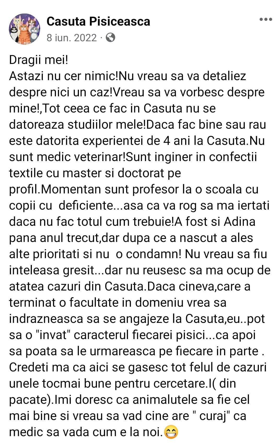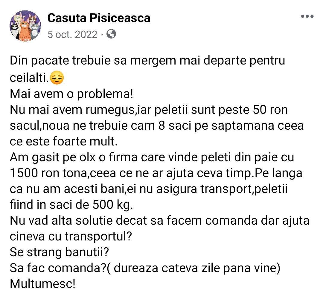 „Mi-a dat un mesaj foarte drăguț, ca și cum ar fi din partea pisicilor. Mi-a povestit că au 180 de pisicuțe, că au facturi neplătite la veterinari, că nu vor mai avea curând ce mânca și că au un nou sediu. Mi s-au părut și atunci multe 180 de pisici, dar m-am gândit că trebuie să le ia cineva de pe stradă. M-am uitat pe site-ul lor, Instagram și Facebook. Totul părea în regulă. Mi s-a părut interesant și că am avut încurajarea oamenilor din chat-ul meu, care erau din Iași și au auzit de asociație”, a povestit Ruxandra.