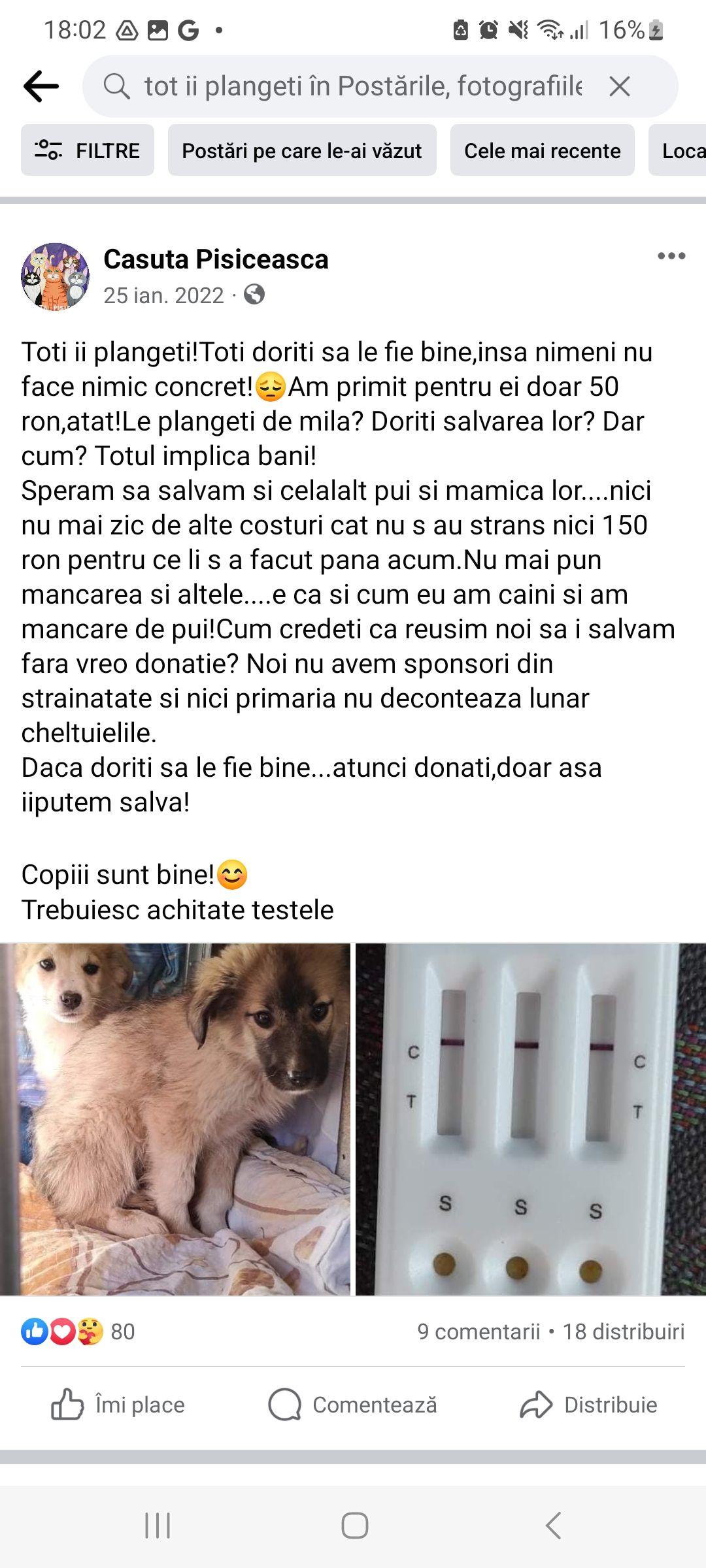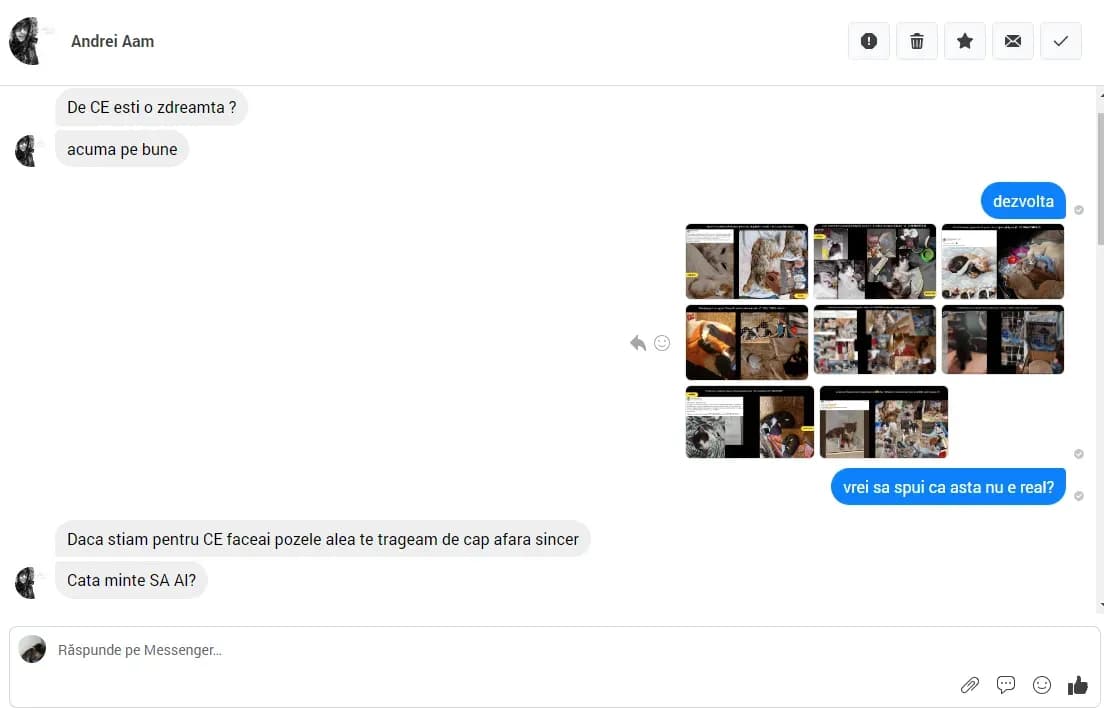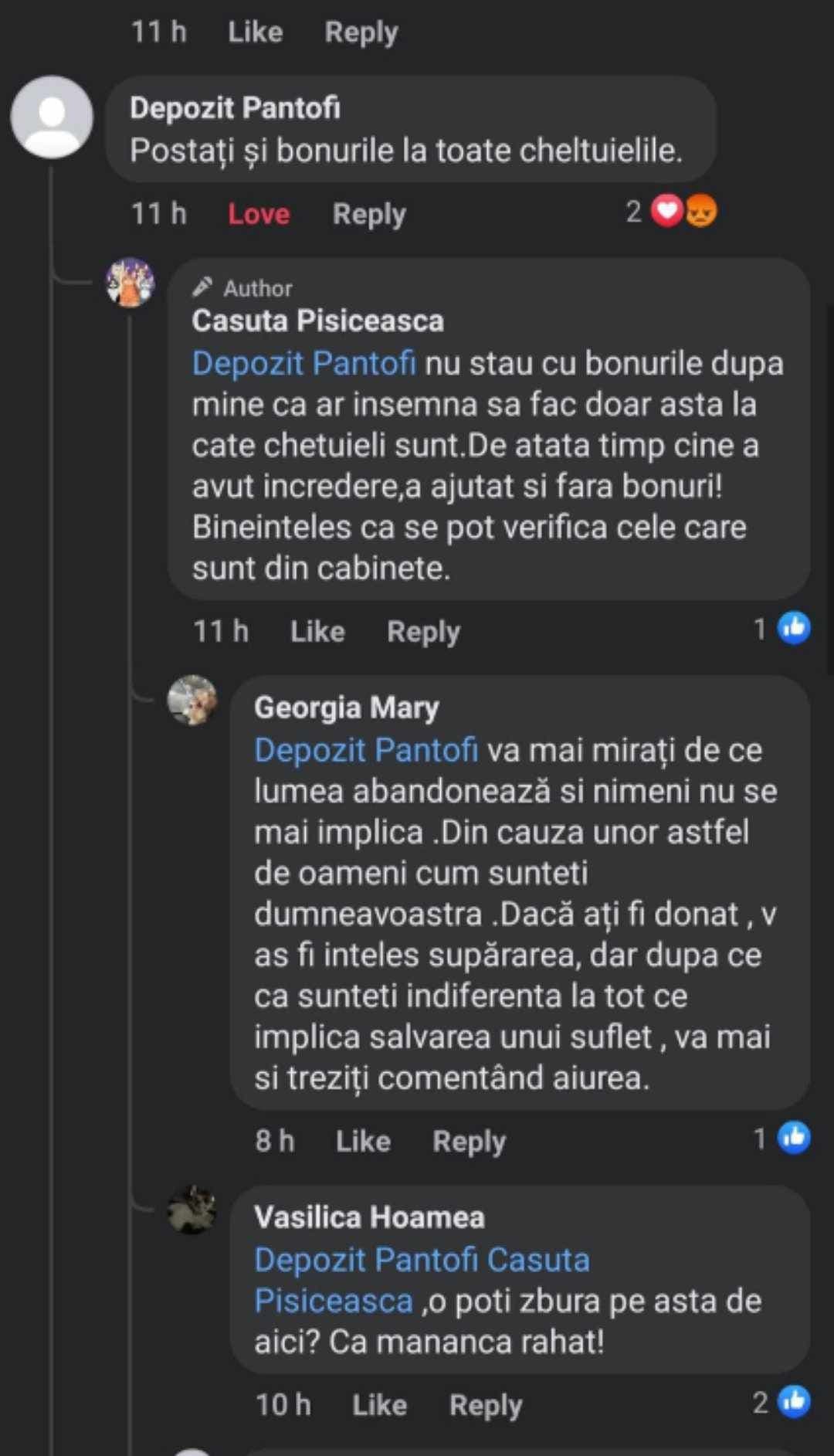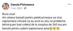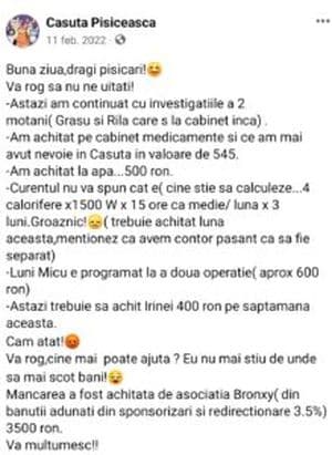 Între timp, Gianina, proprietara adăpostului, îi certa pe Facebook pe cei care nu donau suficient pentru cățeii strânși de ea.