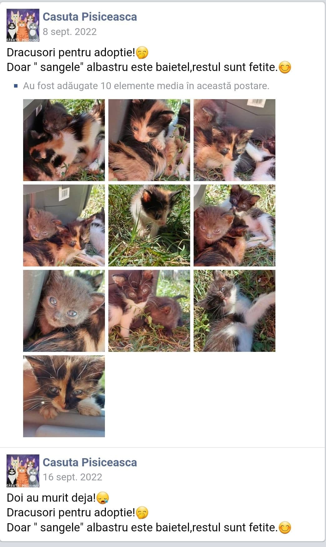 „Pisici bolnave peste tot. Erau pisicuțe zombie. Blănița lor era sub orice critică de mizerabilă, miroseau îngrozitor, toate aveau secreții. Toate. Una în mod special avea gura plină de sânge. Nu putea să se hrănească. Mieuna foarte gâjâit și înfundat”, povestește Mihaela.