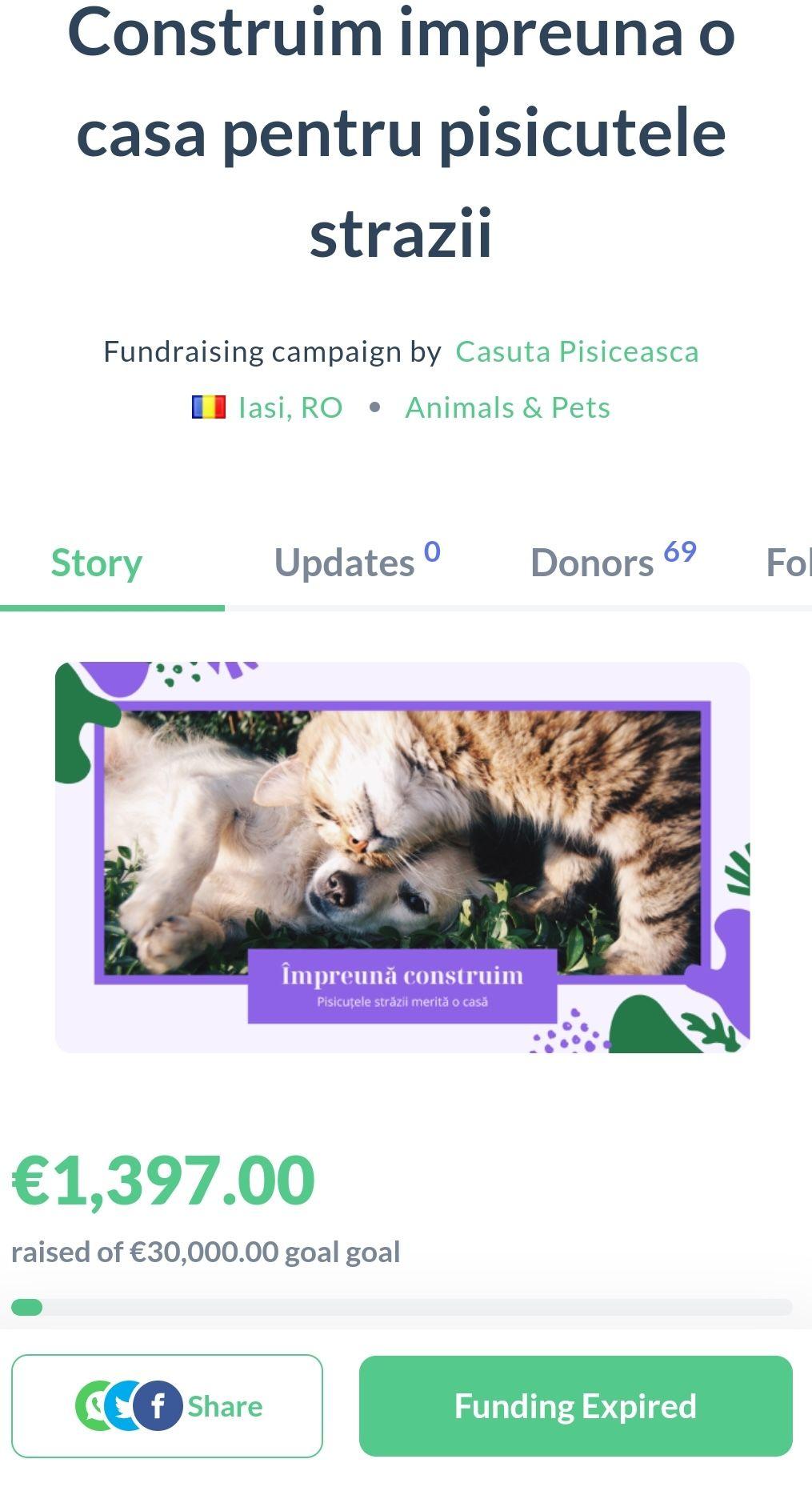 În anul 2023, din doar două postări pe Facebook, pentru Căsuța Pisicească s-au strâns peste 15.000 de lei de la mai mult de 300 de donatori. Cu toate astea, pisicile, după ce au îndurat canicula din vară în construcția improvizată din câmp, au de îndurat acum frigul iernii.