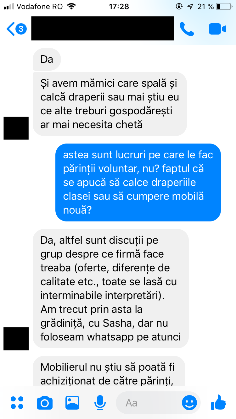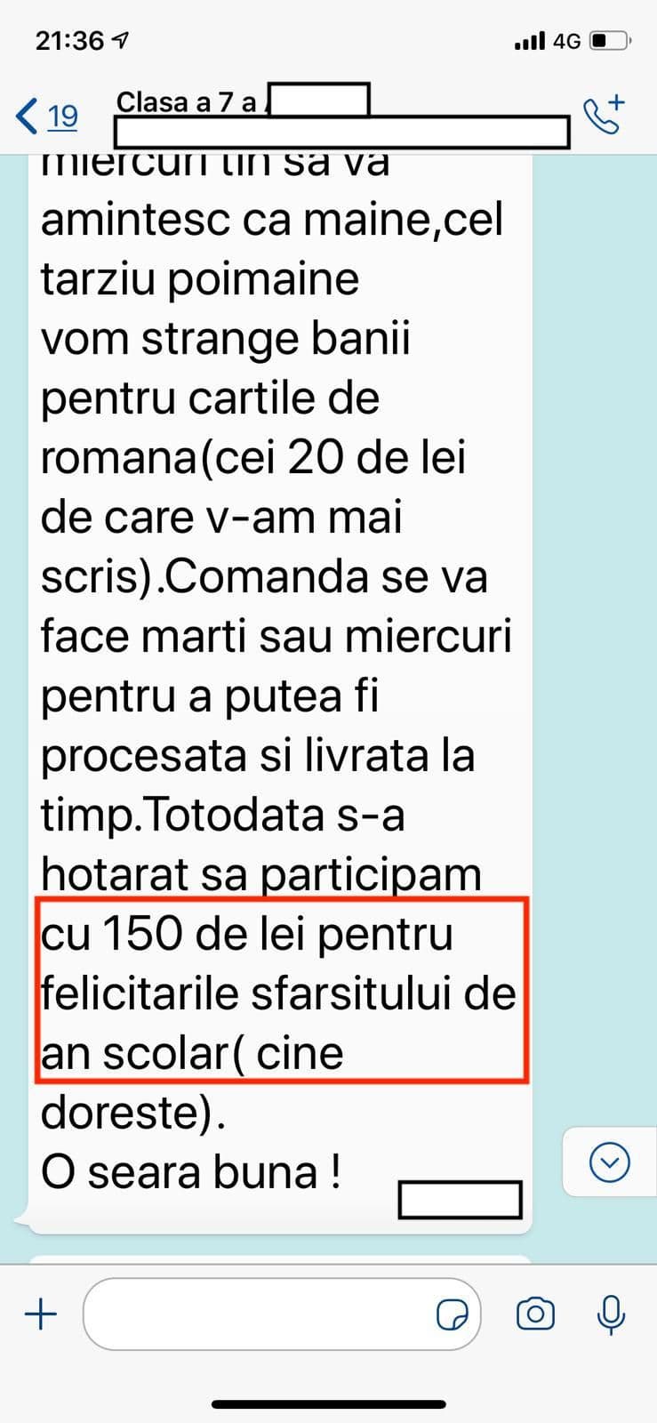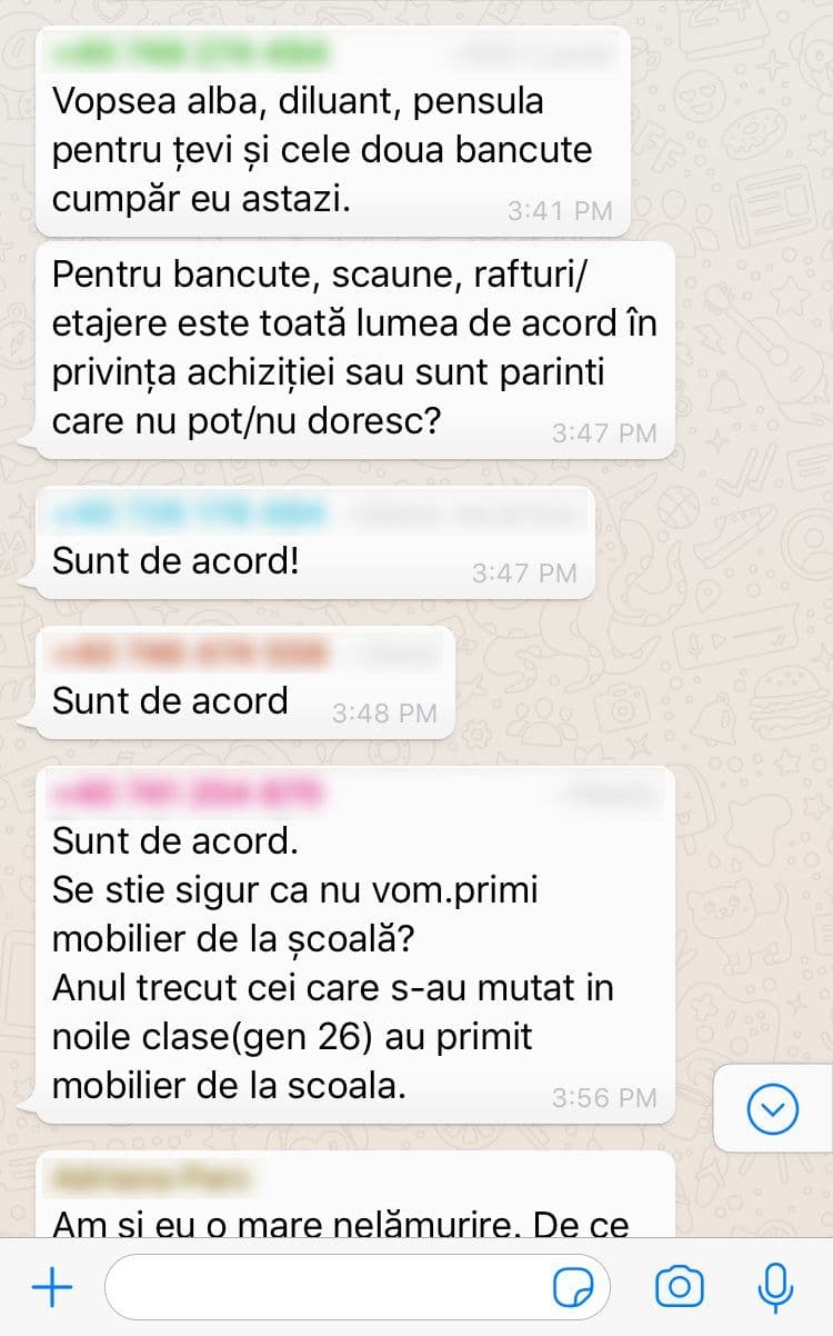 Părinți din București, Cluj și Timișoara ne-au împărtășit, sub protecția anonimatului, fragmente din „bucătăriile interne” ale grupurilor de whatsapp, unde, de cele mai multe ori, nimic nu e prea mult pentru ca elevilor să le fie bine pe parcursul întregului an școlar – fie că vorbim despre a strânge sume mari de bani sau despre diverse munci și servicii pe care aceștia se oferă să le facă gratuit, cu rol compensator.