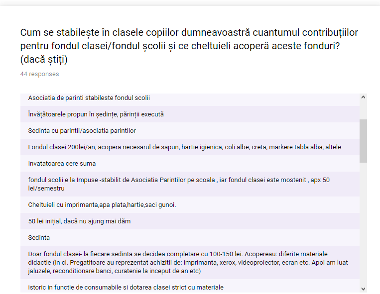 Am rugat alți părinți să completeze un chestionar în care să precizeze dacă plătesc fondul clasei sau al școlii, cum este decis cuantumul acestuia și dacă știu cum sunt cheltuiți acești bani.