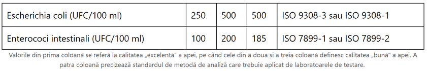 Pentru ca apele să fie potrivite pentru îmbăiere, concentrația de E-coli și enterococi depistată trebuie să se încadreze în valorile stabilite de directiva europeană 2006/7/CE a Parlamentului European și a Consiliului din 15 februarie 2006 privind gestionarea calității apei pentru scăldat, aplicată, în România, prin hotărârea nr. 546/2008 privind gestionarea calităţii apei de îmbăiere.