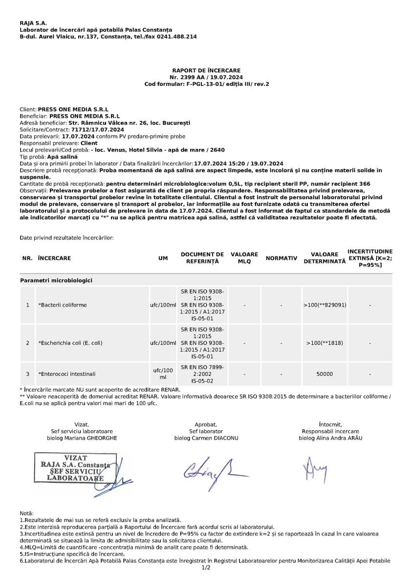 Analiza independentă PressOne și Info Sud-Est a fost realizată de RAJA (Regia Autonomă Județeană Constanța), care are un laborator acreditat RENAR și după aceleași standarde ISO (7899-2 la enterococi și 9308-1 la E-coli) specificate de legislație, după instrucțiunile instituției și cu recipientele sterile oferite de instituție.