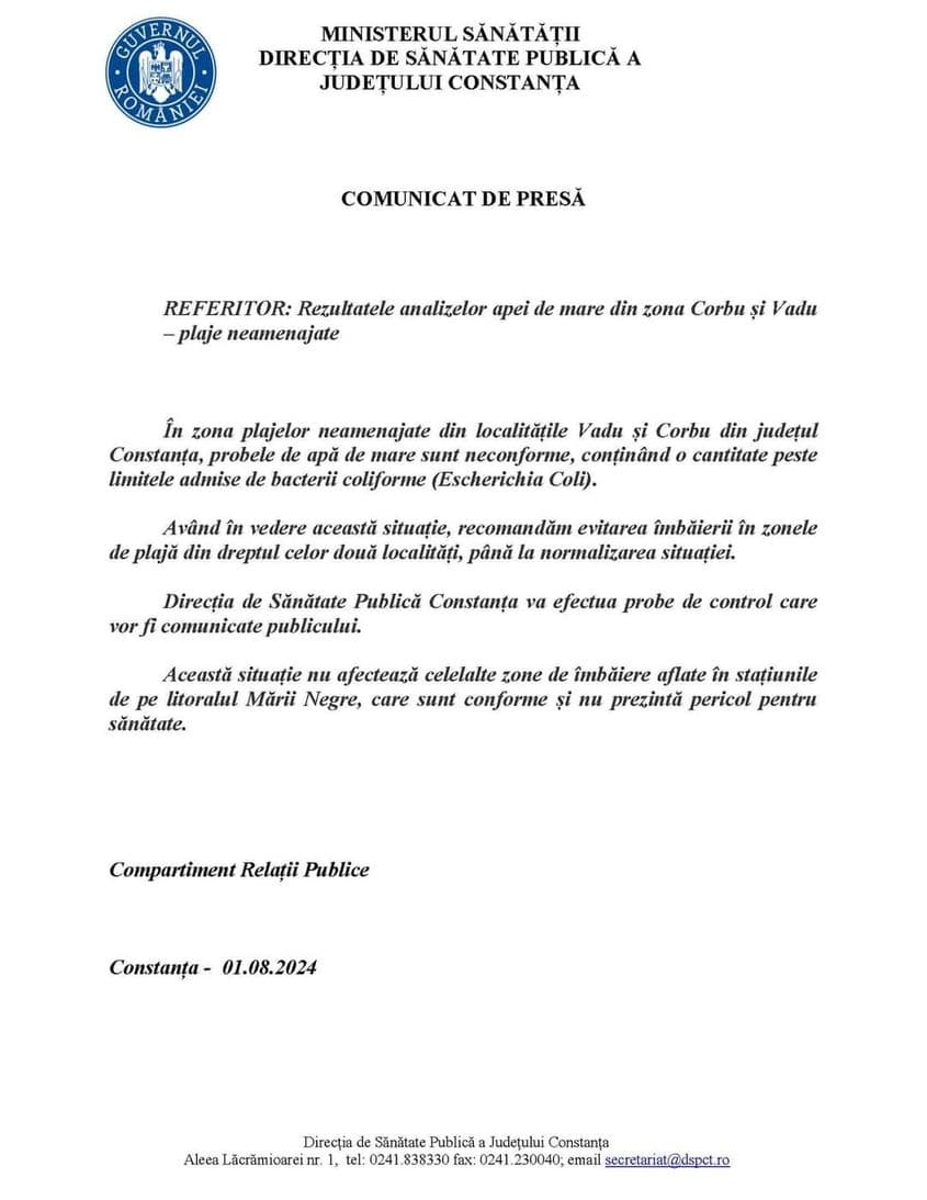 Confruntată cu faptul că articolul va fi publicat, la o zi după ce a primit întrebările, Direcția de Sănătate Publică Constanța a transmis un comunicat de presă în care avertizează cu privire la calitatea apei la Vadu și la Corbu și recomandă evitarea îmbăierii.