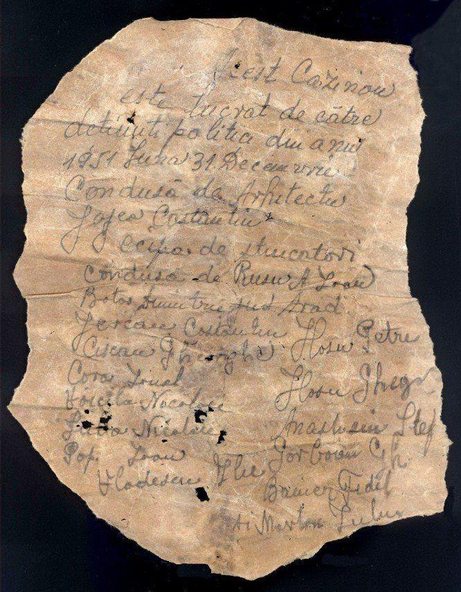 „Acest Cazinou este lucrat de către deţinuţii politici din anul 1951 luna 31 Decembrie, condusă de arhitectul Joja Constantin. Echipa de stucatori condusă de Rusu A. Ioan, Botoş Dumitru jud. Arad, Jercău Constantin, Ciscău Gheorghe, Coraş Ionel, Sava Nicolae, Pop Ioan, Vlădescu Ilie, Hosu Petre, Hosu Ghegor, Anastasiu Ştefan, Gorbovan Gh., Bamer Fidel şi Morton Iuliu”. Mesajul găsit în tencuiala Cazinoului din Constanța în mai 2020