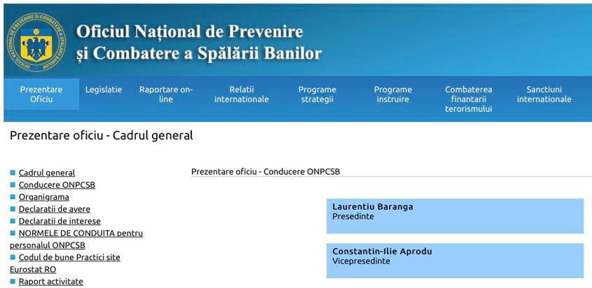 Fapt divers: la șase zile de la demisie și la două zile după plasarea sa în arest la domiciliu, Laurențiu Barangă încă figurează pe site ca președinte al Oficiului Național de Prevenire și Combatere a Spălării Banilor: