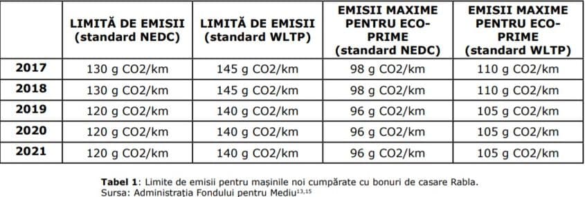„Concentrația de emisii maximă a mașinilor care se pot achiziționa prin Programul Rabla a avut ca prag de referință media europeană a emisiilor de CO2, de 130g/km”, răspunde AFM.