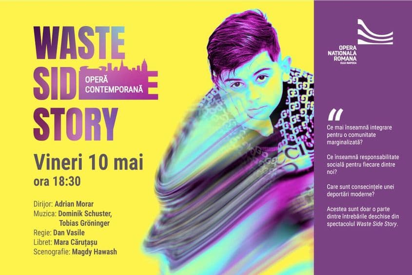 - Waste Side Story vineri, de la 18:30 la Opera Națională Română. Waste Side Story este un spectacol de operă contemporană care vorbește despre comunitatea oamenilor de la Pata Rât. (30 - 55 de lei)
