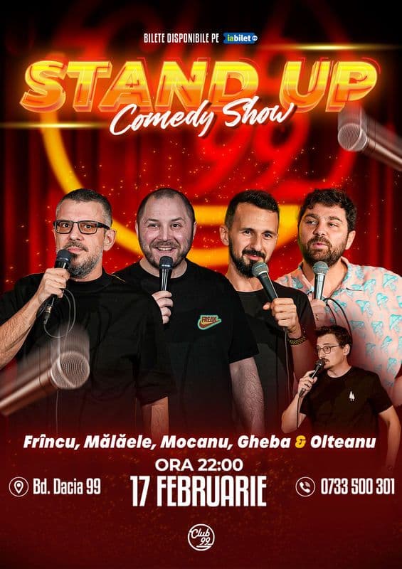 Mai târziu, de la 22:00, același Frînculescu schimbă partenerii de scenă și povestește cu Mălăele (Bogdan), Mocanu, Raul Gheba și Vlad Olteanu la Club 99 (65 de lei). În aceeași seară, tot de la 22:00, poți să-i vezi pe Ioana State, Geo Adrian, Bogdan Mălăele și Mukinka la The Fool sâmbătă (40 de lei). Puțin mai târziu, de la 22:30, Sorin, Toma, Popesco și Virgil au show la Comics Club (65 de lei).