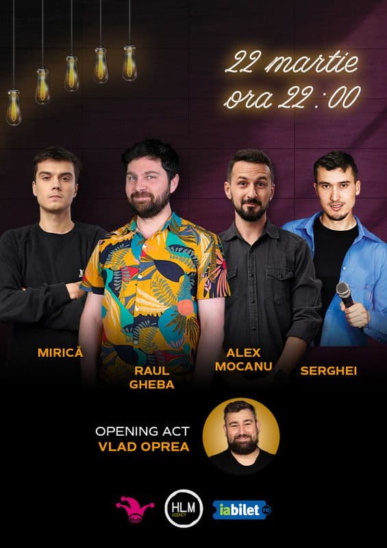Mai târziu, de la 22:00, Toma, Ciobanu, Bogzi și Ioana Luiza au shou la Comics Club (65 de lei). Tot atunci, la Club 99 îi găsești pe Natanticu, Alex Ioniță, Andrei Ciobanu și Edi Vacariu (70 de lei). În același timp, la The Fool au show Sergiu Mirică, Raul Gheba, Alex Mocanu și Serghei (60 de lei).