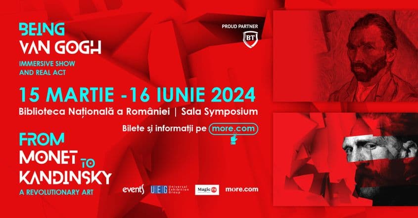 „Being Van Gogh” și „The Revolutionary Art: From Monet to Kandinsky” sunt două expoziții imersive care promit o experiență multimedia, atât vizual prin proiecțiile realizate pe arhitectura sălii Symposium din cadrul Bibliotecii Naționale, cât și prin vocea actorului Marius Manole, în rolul lui Van Gogh. Proiectul artistic propune o combinație în care inteligența artificială și arta pictorilor moderniști expun imagini semnificative interpretate în stilul pictorilor Vincent Van Gogh, Edvard Munch, Claude Monet sau Wassily Kandinsky. Expoziția poate fi văzută între 15 martie și 16 iunie la Biblioteca Națională a României. Sâmbăta și duminica poate fi vizitată între 10:00 și 20:00 (40 de lei).