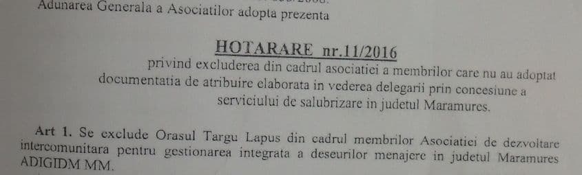 Nu mai demult de 2016, Asociația de Dezvoltare Intercomunitară pentru Gestionarea Integrată a Deșeurilor Menajere din Maramureș a cerut excluderea orașului Târgu Lăpuș din rândurile sale.