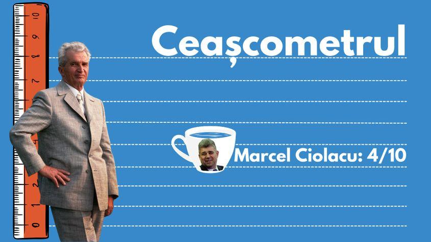 Marcel Ciolacu primește din partea PressOne 4 cești din 10 pe scara Ceașcometrului. Cele patru puncte sunt pentru efortul de a îmbrățișa atâția oameni, dar nu trece pragul de 5 pentru că n-a „zăgăzuit” viituri și nici n-a reușit să construiască o casă în 12 zile.