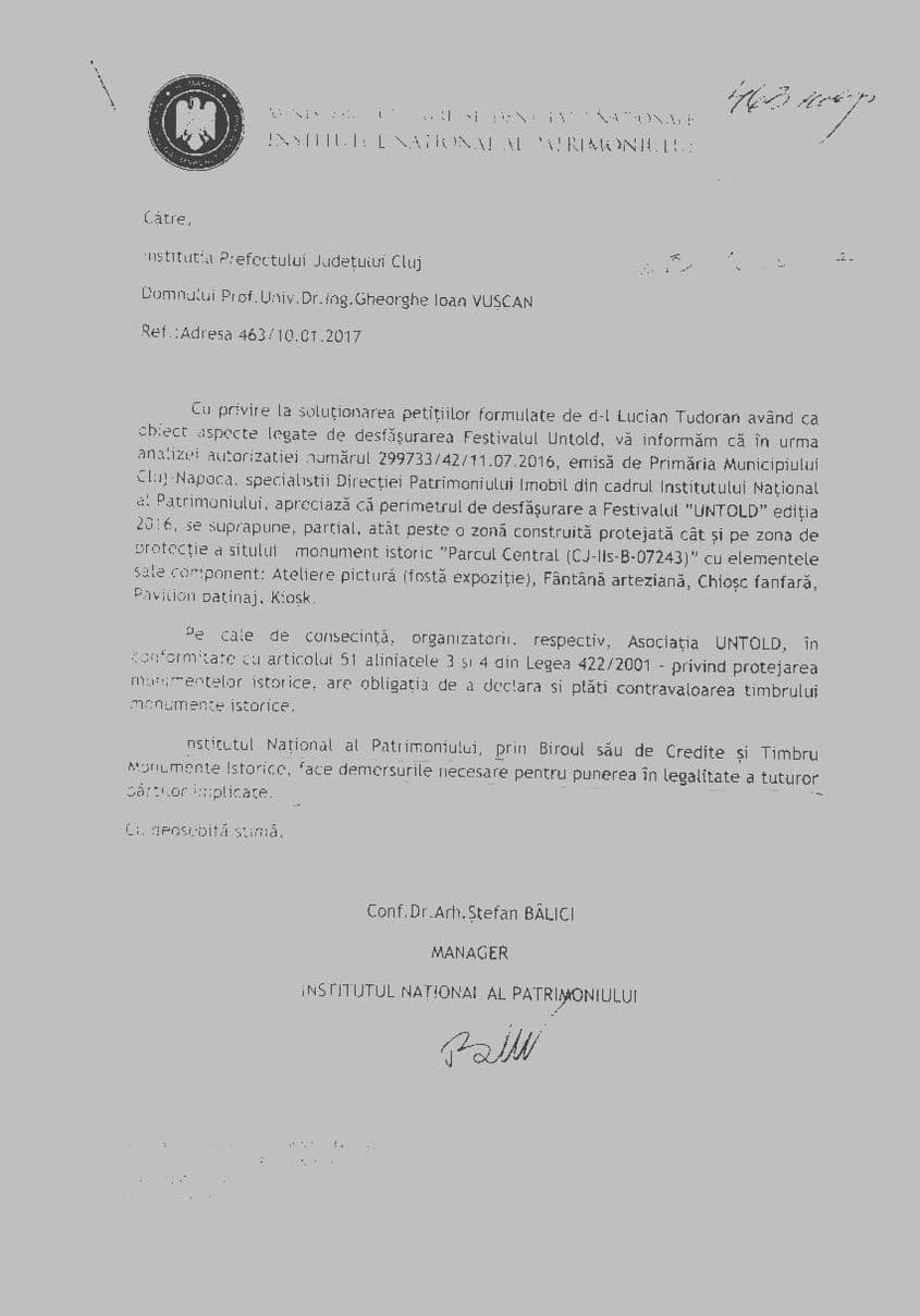 În fine, pe 10 februarie 2017, Institutul Naţional al Patrimoniului a notificat Prefectura Cluj că – în demersul de soluționare a petițiilor formulate de cetățeanul Lucian Todoran – a realizat că „perimetrul de desfășurare a Festivalului Untold ediția 2016 se suprapune parțial atât peste o zonă construită protejată, cât și pe zona de protecție a sitului-monument istoric Parcul Central”.