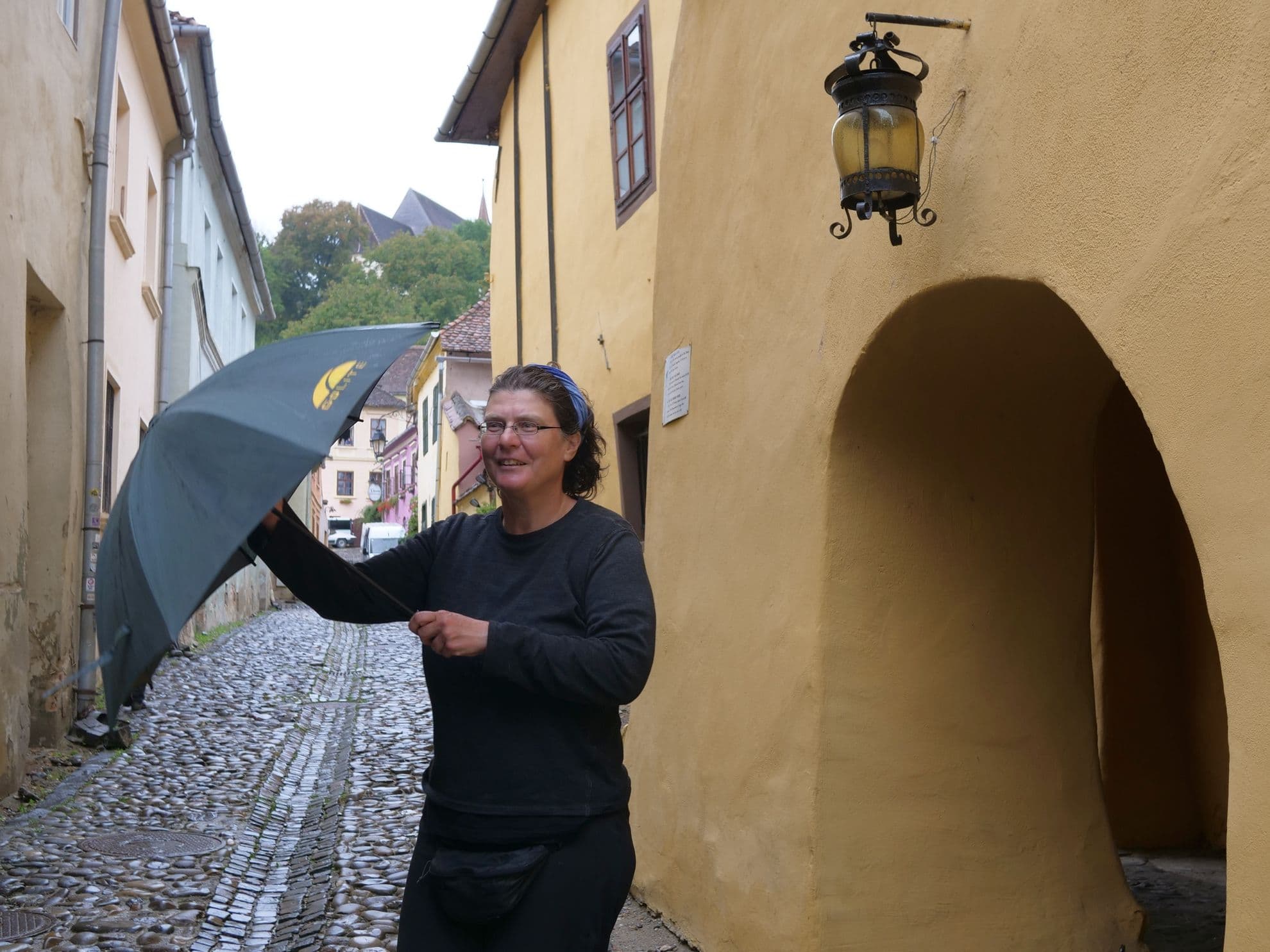 Plouă mărunt și rece. Urc scările în orașul vechi, unde Christine a tras aseară târziu la o pensiune. De dragul meu, azi și-a luat o zi de odihnă, mai ales că va ploua mult și bine, iar pe Via Transilvanica nu e tocmai o fericire să frămânți noroaie prin păduri pustii. Ne-am revăzut ca doi vechi prieteni. Era nevorbită de o săptămână, așa că s-a apucat să-mi povestească în rafală ultimele ei aventuri, nu înainte de a mă avertiza.