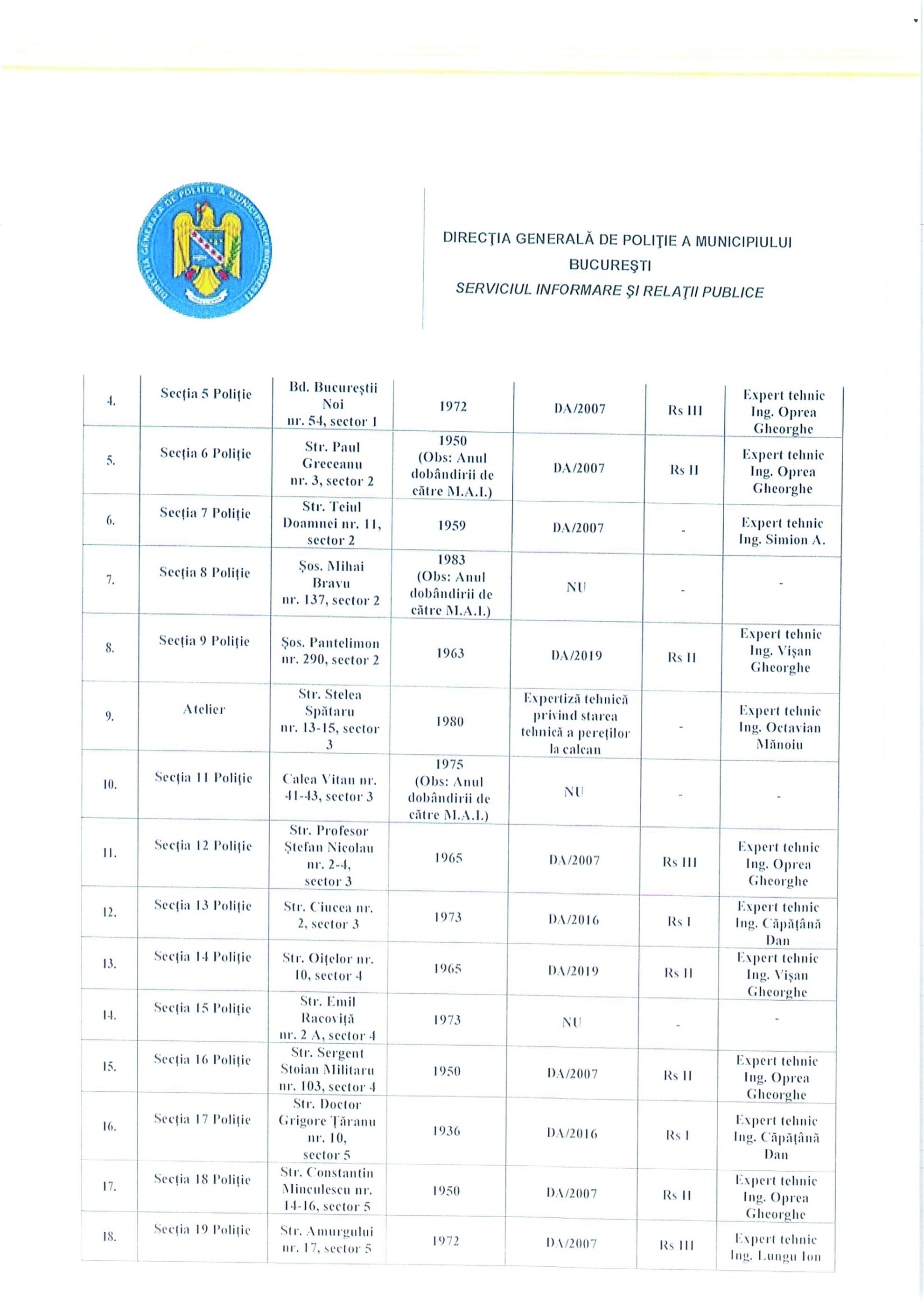 Secțiile în discuție nu apar în lista de clădiri a Administrației Municipale pentru Consolidarea Clădirilor cu Risc Seismic. În lista de la PMB sunt clădiri rezidențiale. Clădiri multietajate, mai mari de P+3, dar cu destinația locuință. Pentru că ele erau beneficiarele principale ale ordonanței, programului de finanțare care funcționează sub OG 20/1994”, explică specialistul.