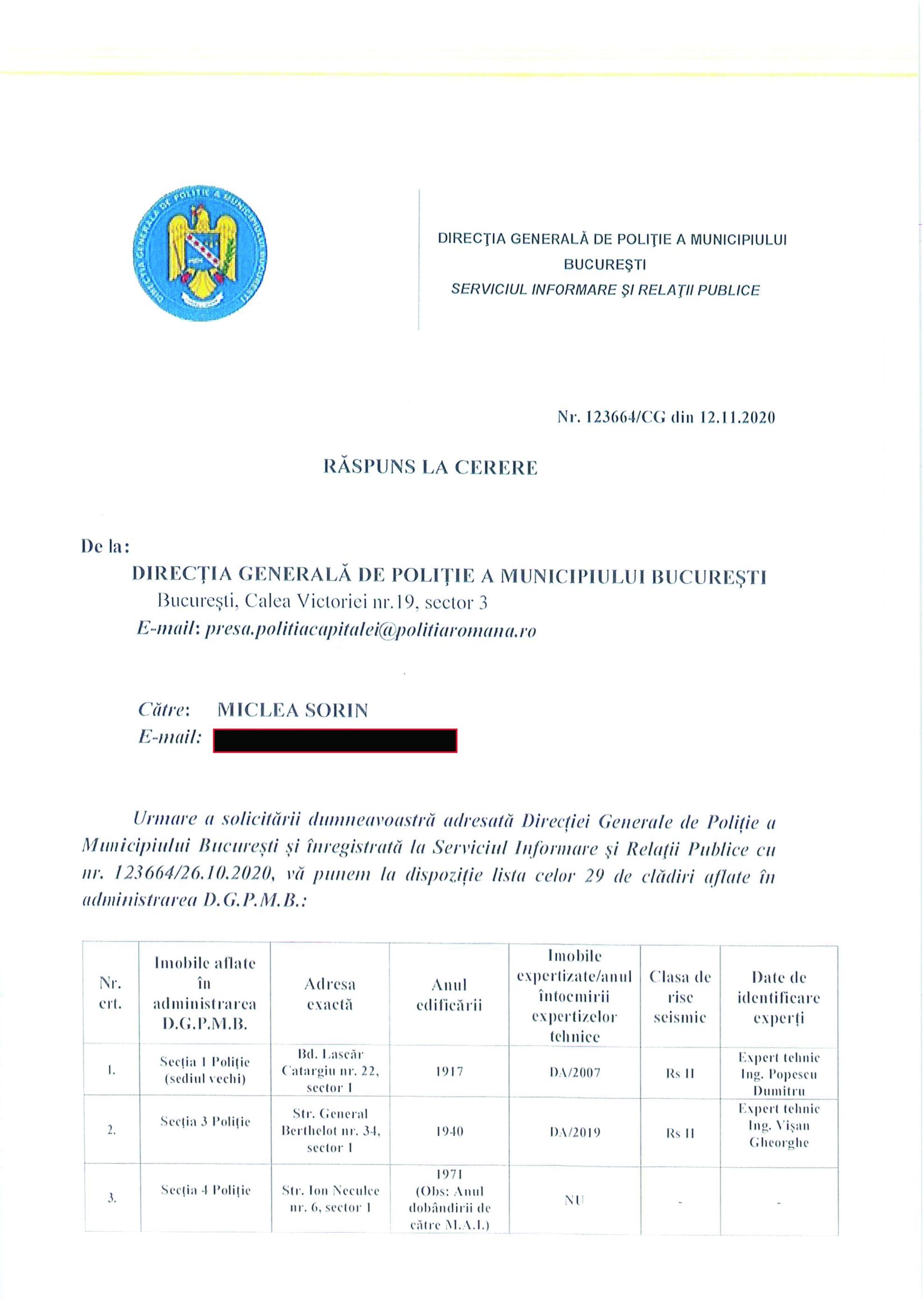 Într-un răspuns la multiplele solicitări făcute de Sorin Miclea, D.G.P.M.B. arată că, din cele 29 de sedii de Poliție de pe raza Capitalei, 16 au fost expertizate, din care 14 sunt încadrate în clasele I, II sau III de risc seismic.