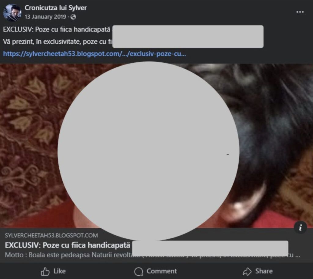 Sau cu postările sale. Un exemplu este una în care publica, în „exclusivitate”, poze cu persoane cu dizabilități, ca formă de răzbunare pentru cel cu care avea, la momentul respectiv, o dispută online.