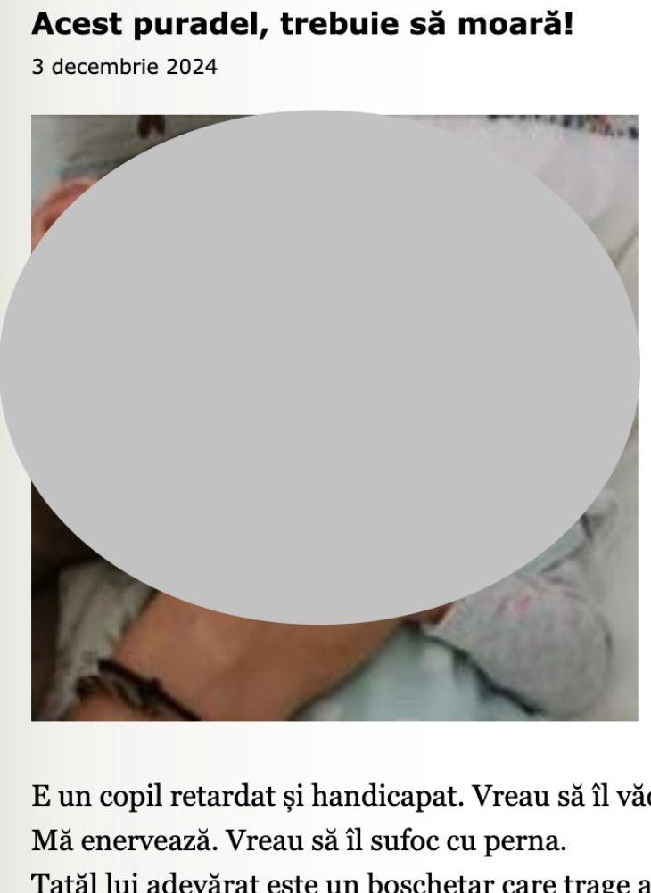 Într-o postare din decembrie 2024 de pe același blog, bărbatul publica o imagine cu un bebeluș de câteva luni alături de, cel mai probabil, tatăl său. Imaginea era însoțită de mesajul „acest puradel trebuie să moară (...) vreau să îl văd că crapă! (...) vreau să îl sufoc cu perna”.